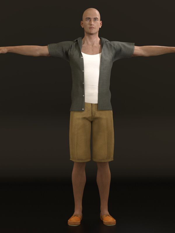 The textures that come with the set and the additional textures available for purchase separately are highly detailed, but flawed. The textures appear to have been built, in many cases, from photographic references. But there appears to have been little effort to remove the tell tale signs that these items have been photographed. There are clear specular highlights and reflections visible in the leather textures for the shoes and particularly in the buttons for both the shirt and the shorts. There are also painted on details, like wrinkles on the shirt and pleats on the front of the shorts. The details contain artificial highlights and shadows.